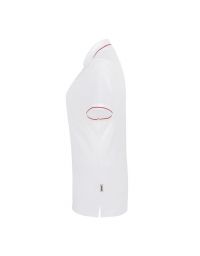 Hochwertiges, sportives Piqué-Poloshirt für Damen aus langstapeliger, ringgesponnener Baumwolle mit körpernahem Schnitt. Verlängerte, mit Kontrastfarbe unterlegte 4-Loch-Knopfleiste mit extra haltbar vernähten, bruchsicheren Ton-in- Ton-Knöpfen. Modische Kontraststreifen im Kragen und an den Armbündchen, Nackenband, doppelt geriegelte Seitenschlitze.