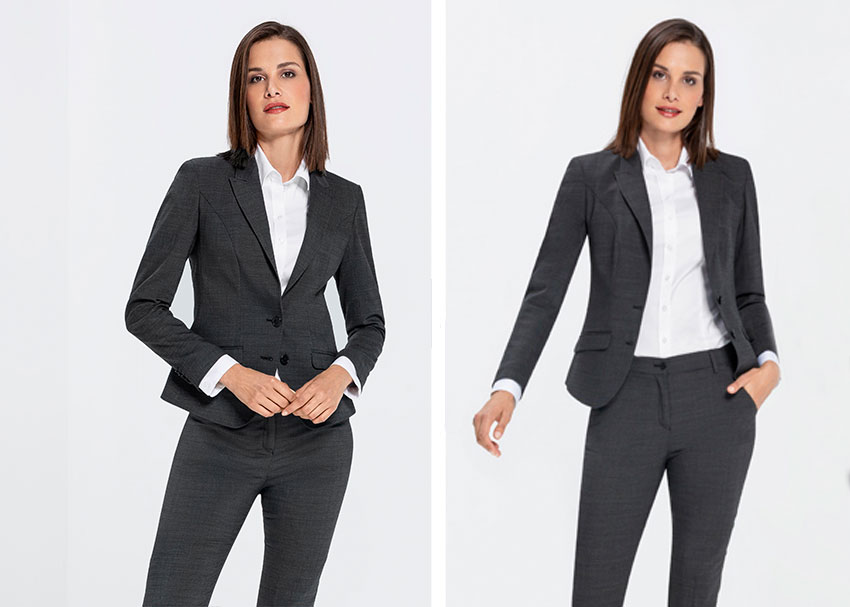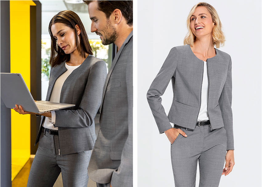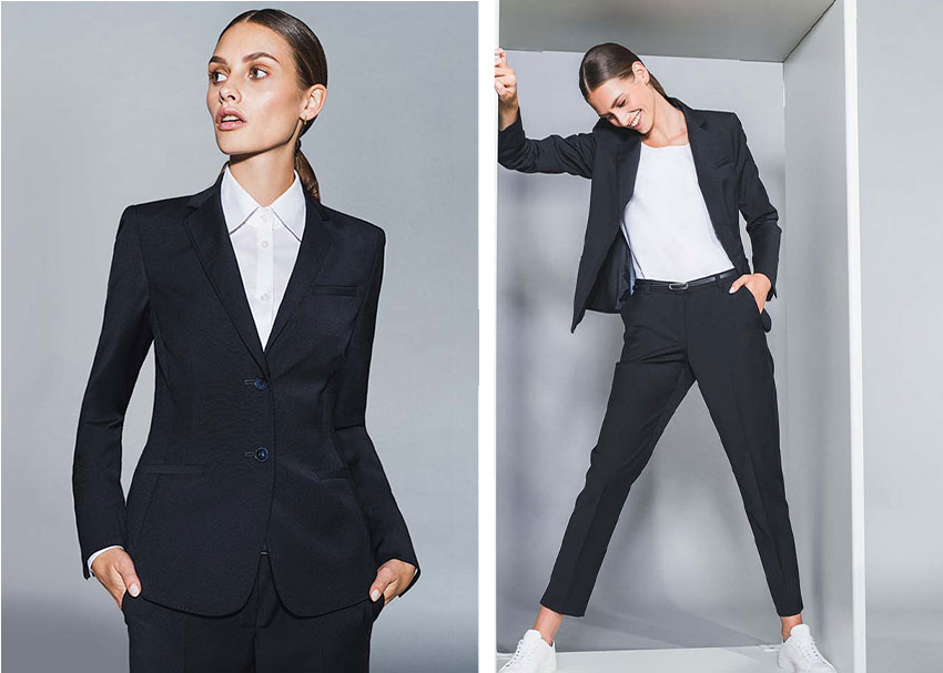 A trouser suit is an elegant business outfit for women, which in the classic sense consists of a blazer and matching trousers. In the office, at trade fairs or for formal occasions, a trouser suit is an elegant and formal fashion combination for women. It offers women a stylish alternative to dresses and skirts and is available in different cuts, styles and colours. Trouser suits are available in many sizes and colours in our shop and you can combine the blazers individually with trousers and skirts.